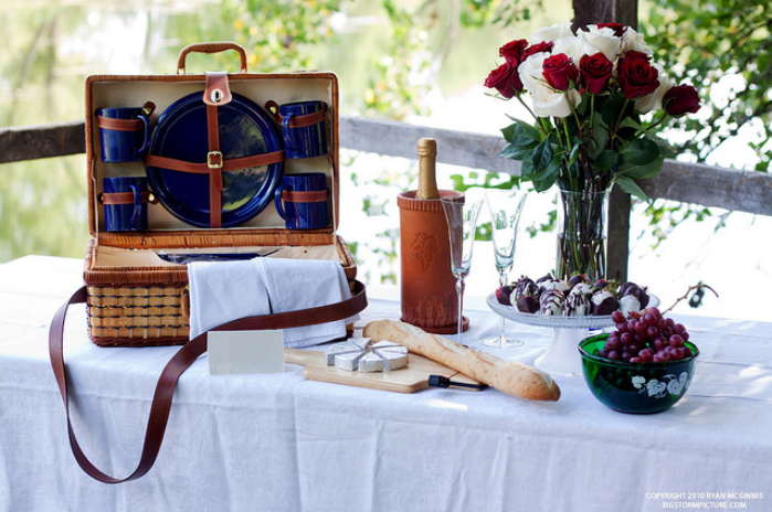 A romantic picnic is a lovely way to spend Valentine's Day if you live in a warmer climate. Set out a blanket on the grass, indulge in champagne and chocolate-covered strawberries, and lie down next to your love to cloud watch and talk. For a casual picnic, wear a plaid shirt over a blue, silky dress, polka dot headband, and purple Keds. If it's a fancier picnic, don a blue sleeveless dress, heart-shaped earrings, a blue cuff, and bow heels.
