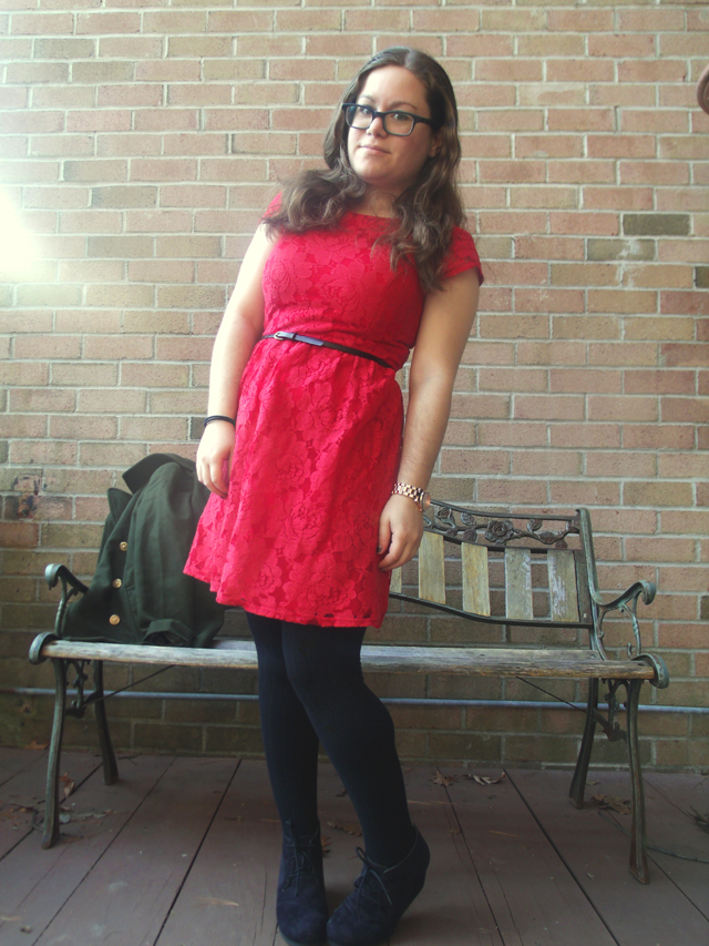 This is what I wore to my office holiday party last week. I think the shift-style and higher neckline works for an event with co-workers, but the lace and bright red color makes it fun. Last time I wore this dress, I didn't wear a belt or tights, but now that it's cold I like how the black accessories make the red pop.